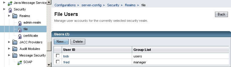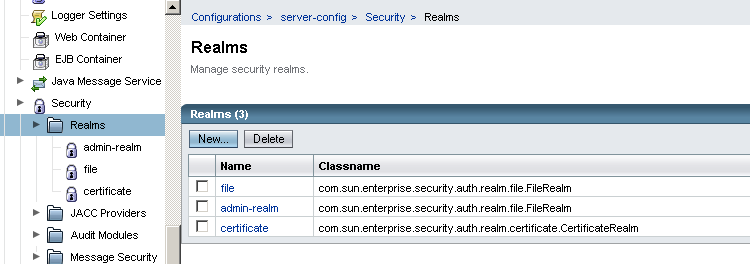 File-basierten Realms eignen sich ideal für die Entwicklungs- und Testphase, da man auf die Anbindung komplizierter Firmen-Legacy verzichten kann. Im Tomcat gibt es dafür die tomcat-user.xml. Im Glassfish können File-basiertes Realm über die Admin-Console verwaltet werden. Dazu in der Admin-Console Configuration - Security - Realms wählen: